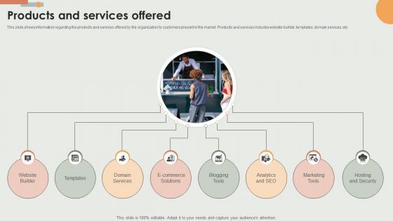 This slide shows information regarding the products and services offered by the organization to customers present in the market. Products and services includes website builder, templates, domain services, etc. Coming up with a presentation necessitates that the majority of the effort goes into the content and the message you intend to convey. The visuals of a PowerPoint presentation can only be effective if it supplements and supports the story that is being told. Keeping this in mind our experts created Products And Services Offered E Commerce Solutions Offering Company Fundraising Pitch Deck to reduce the time that goes into designing the presentation. This way, you can concentrate on the message while our designers take care of providing you with the right template for the situation. This slide shows information regarding the products and services offered by the organization to customers present in the market. Products and services includes website builder, templates, domain services, etc.