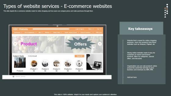 This slide depicts the e-commerce websites made for online shopping and how users can compare prices and make purchases through them. This Types Of Website Services Directory Role Web Designing User Engagement Portrait PDF from Slidegeeks makes it easy to present information on your topic with precision. It provides customization options, so you can make changes to the colors, design, graphics, or any other component to create a unique layout. It is also available for immediate download, so you can begin using it right away. Slidegeeks has done good research to ensure that you have everything you need to make your presentation stand out. Make a name out there for a brilliant performance. This slide depicts the e-commerce websites made for online shopping and how users can compare prices and make purchases through them.