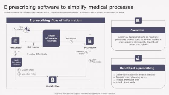 This slide covers e prescribing software to enhance healthcare services. It involves flow of information and benefits such as quickly reconciliation of medication history and instant clinical alerts. Slidegeeks is here to make your presentations a breeze with E Prescribing Software Simplify Healthcare Information Tech To Enhance Medical Facilities Slides Pdf With our easy to use and customizable templates, you can focus on delivering your ideas rather than worrying about formatting. With a variety of designs to choose from, you are sure to find one that suits your needs. And with animations and unique photos, illustrations, and fonts, you can make your presentation pop. So whether you are giving a sales pitch or presenting to the board, make sure to check out Slidegeeks first This slide covers e prescribing software to enhance healthcare services. It involves flow of information and benefits such as quickly reconciliation of medication history and instant clinical alerts.