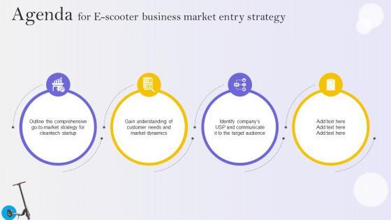 Find a pre-designed and impeccable Agenda For E Scooter Business Market Entry Strategy. The templates can ace your presentation without additional effort. You can download these easy-to-edit presentation templates to make your presentation stand out from others. So, what are you waiting for Download the template from Slidegeeks today and give a unique touch to your presentation. Our Agenda For E Scooter Business Market Entry Strategy are topically designed to provide an attractive backdrop to any subject. Use them to look like a presentation pro.