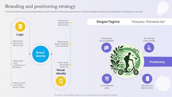 The following slide showcases the branding strategy to position cleantech startup among target audience. It showcases strategic elements such as slogan or tagline, brand identity, logo, visual, etc.Boost your pitch with our creative Branding And Positioning Strategy E Scooter Business Market Entry Strategy. Deliver an awe-inspiring pitch that will mesmerize everyone. Using these presentation templates you will surely catch everyones attention. You can browse the ppts collection on our website. We have researchers who are experts at creating the right content for the templates. So you do not have to invest time in any additional work. Just grab the template now and use them. The following slide showcases the branding strategy to position cleantech startup among target audience. It showcases strategic elements such as slogan or tagline, brand identity, logo, visual, etc.
