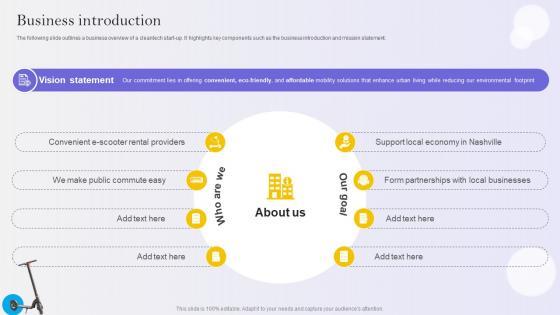 The following slide outlines a business overview of a cleantech start-up. It highlights key components such as the business introduction and mission statement.Create an editable Business Introduction E Scooter Business Market Entry Strategy that communicates your idea and engages your audience. Whether you are presenting a business or an educational presentation, pre-designed presentation templates help save time. Business Introduction E Scooter Business Market Entry Strategy is highly customizable and very easy to edit, covering many different styles from creative to business presentations. Slidegeeks has creative team members who have crafted amazing templates. So, go and get them without any delay. The following slide outlines a business overview of a cleantech start-up. It highlights key components such as the business introduction and mission statement.