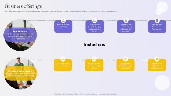 This slide presents products and services offered by cleantech startup business. It showcases components such as scooter rental and scooter sharing service.Slidegeeks is one of the best resources for PowerPoint templates. You can download easily and regulate Business Offerings E Scooter Business Market Entry Strategy for your personal presentations from our wonderful collection. A few clicks is all it takes to discover and get the most relevant and appropriate templates. Use our Templates to add a unique zing and appeal to your presentation and meetings. All the slides are easy to edit and you can use them even for advertisement purposes. This slide presents products and services offered by cleantech startup business. It showcases components such as scooter rental and scooter sharing service.
