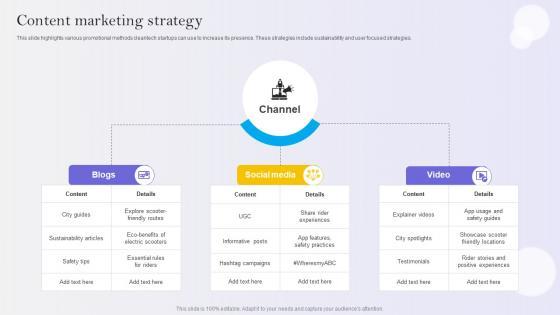 This slide highlights various promotional methods cleantech startups can use to increase its presence. These strategies include sustainability and user focused strategies.There are so many reasons you need a Content Marketing Strategy E Scooter Business Market Entry Strategy. The first reason is you can not spend time making everything from scratch, Thus, Slidegeeks has made presentation templates for you too. You can easily download these templates from our website easily. This slide highlights various promotional methods cleantech startups can use to increase its presence. These strategies include sustainability and user focused strategies.