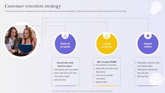 The slide showcases various strategies to maximize customer retention rate and business profitability. It outlines components such as referral, loyalty program and helmet selfies.From laying roadmaps to briefing everything in detail, our templates are perfect for you. You can set the stage with your presentation slides. All you have to do is download these easy-to-edit and customizable templates. Customer Retention Strategy E Scooter Business Market Entry Strategy will help you deliver an outstanding performance that everyone would remember and praise you for. Do download this presentation today. The slide showcases various strategies to maximize customer retention rate and business profitability. It outlines components such as referral, loyalty program and helmet selfies.