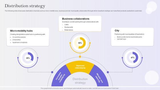 The following slide showcases distribution channels such as micro mobility hubs, business and city municipality collaboration through which cleantech startups can make their products available to customersPresent like a pro with Distribution Strategy E Scooter Business Market Entry Strategy. Create beautiful presentations together with your team, using our easy-to-use presentation slides. Share your ideas in real-time and make changes on the fly by downloading our templates. So whether you are in the office, on the go, or in a remote location, you can stay in sync with your team and present your ideas with confidence. With Slidegeeks presentation got a whole lot easier. Grab these presentations today. The following slide showcases distribution channels such as micro mobility hubs, business and city municipality collaboration through which cleantech startups can make their products available to customers