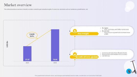 This slide presents an overview of electric scooters market to gain valuable insights. It covers key elements such as market size, growth factors, etc.If you are looking for a format to display your unique thoughts, then the professionally designed Market Overview E Scooter Business Market Entry Strategy is the one for you. You can use it as a Google Slides template or a PowerPoint template. Incorporate impressive visuals, symbols, images, and other charts. Modify or reorganize the text boxes as you desire. Experiment with shade schemes and font pairings. Alter, share or cooperate with other people on your work. Download Market Overview E Scooter Business Market Entry Strategy and find out how to give a successful presentation. Present a perfect display to your team and make your presentation unforgettable. This slide presents an overview of electric scooters market to gain valuable insights. It covers key elements such as market size, growth factors, etc.