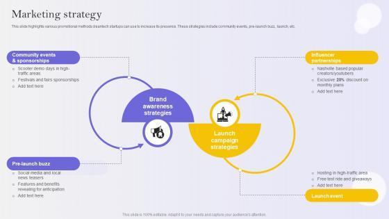 This slide highlights various promotional methods cleantech startups can use to increase its presence. These strategies include community events, pre-launch buzz, launch, etc.Are you in need of a template that can accommodate all of your creative concepts This one is crafted professionally and can be altered to fit any style. Use it with Google Slides or PowerPoint. Include striking photographs, symbols, depictions, and other visuals. Fill, move around, or remove text boxes as desired. Test out color palettes and font mixtures. Edit and save your work, or work with colleagues. Download Marketing Strategy E Scooter Business Market Entry Strategy and observe how to make your presentation outstanding. Give an impeccable presentation to your group and make your presentation unforgettable. This slide highlights various promotional methods cleantech startups can use to increase its presence. These strategies include community events, pre-launch buzz, launch, etc.