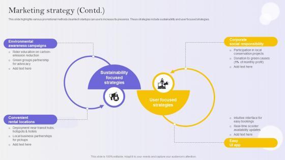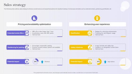 The following slide outlines sales strategy to enhance overall revenue and repeat transactions for cleantech startups. It showcases elements such as extended rentals, geofencing, gamification, etc.This modern and well-arranged Sales Strategy E Scooter Business Market Entry Strategy provides lots of creative possibilities. It is very simple to customize and edit with the Powerpoint Software. Just drag and drop your pictures into the shapes. All facets of this template can be edited with Powerpoint, no extra software is necessary. Add your own material, put your images in the places assigned for them, adjust the colors, and then you can show your slides to the world, with an animated slide included. The following slide outlines sales strategy to enhance overall revenue and repeat transactions for cleantech startups. It showcases elements such as extended rentals, geofencing, gamification, etc.