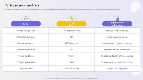 The following slide outlines various KPIs to track and measure cleantech startups operational performance. The metrics are scooter utilization rate, rider satisfaction score, revenue per scooter, etc.Crafting an eye-catching presentation has never been more straightforward. Let your presentation shine with this tasteful yet straightforward Performance Metrics E Scooter Business Market Entry Strategy template. It offers a minimalistic and classy look that is great for making a statement. The colors have been employed intelligently to add a bit of playfulness while still remaining professional. Construct the ideal Performance Metrics E Scooter Business Market Entry Strategy that effortlessly grabs the attention of your audience Begin now and be certain to wow your customers The following slide outlines various KPIs to track and measure cleantech startups operational performance. The metrics are scooter utilization rate, rider satisfaction score, revenue per scooter, etc.