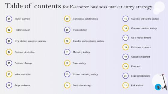 This Table Of Contents For E Scooter Business Market Entry Strategy is perfect for any presentation, be it in front of clients or colleagues. It is a versatile and stylish solution for organizing your meetings. The Table Of Contents For E Scooter Business Market Entry Strategy features a modern design for your presentation meetings. The adjustable and customizable slides provide unlimited possibilities for acing up your presentation. Slidegeeks has done all the homework before launching the product for you. So, do not wait, grab the presentation templates today Our Table Of Contents For E Scooter Business Market Entry Strategy are topically designed to provide an attractive backdrop to any subject. Use them to look like a presentation pro.