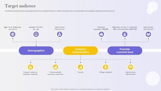 The following slide shows the ideal target audience for a cleantech start-up. It outlines elements such as characteristics, demographics, potential customer base, etc.Welcome to our selection of the Target Audience E Scooter Business Market Entry Strategy. These are designed to help you showcase your creativity and bring your sphere to life. Planning and Innovation are essential for any business that is just starting out. This collection contains the designs that you need for your everyday presentations. All of our PowerPoints are 100 percent editable, so you can customize them to suit your needs. This multi-purpose template can be used in various situations. Grab these presentation templates today. The following slide shows the ideal target audience for a cleantech start-up. It outlines elements such as characteristics, demographics, potential customer base, etc.