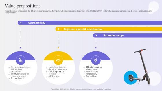 This slide outlines various factors that differentiate cleantech start-up offerings from other businesses providing similar service. It highlights USPs such creative cleantech experience, local cleantech sourcing, community engagement, etc.Explore a selection of the finest Value Propositions E Scooter Business Market Entry Strategy here. With a plethora of professionally designed and pre-made slide templates, you can quickly and easily find the right one for your upcoming presentation. You can use our Value Propositions E Scooter Business Market Entry Strategy to effectively convey your message to a wider audience. Slidegeeks has done a lot of research before preparing these presentation templates. The content can be personalized and the slides are highly editable. Grab templates today from Slidegeeks. This slide outlines various factors that differentiate cleantech start-up offerings from other businesses providing similar service. It highlights USPs such creative cleantech experience, local cleantech sourcing, community engagement, etc.
