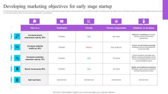 The following slide showcases various promotional goals for newly established business. Higher brand awareness, increasing web traffic, boosting customer lifetime value, and higher sales are the major objectives which are outlined in slide along with timeline, priority, person responsible, and initiatives. Slidegeeks is here to make your presentations a breeze with Comprehensive Guide To Build Marketing Developing Marketing Objectives For Early Stage Startup Designs PDF With our easy-to-use and customizable templates, you can focus on delivering your ideas rather than worrying about formatting. With a variety of designs to choose from, you are sure to find one that suits your needs. And with animations and unique photos, illustrations, and fonts, you can make your presentation pop. So whether you are giving a sales pitch or presenting to the board, make sure to check out Slidegeeks first.