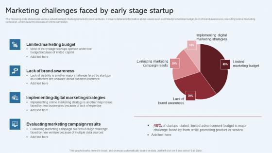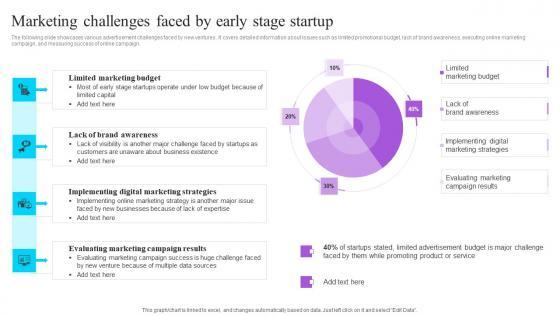 The following slide showcases various advertisement challenges faced by new ventures. It covers detailed information about issues such as limited promotional budget, lack of brand awareness, executing online marketing campaign, and measuring success of online campaign. The Marketing Challenges Faced By Early Stage Startup Effective Startup Promotion Plan Guidelines Pdf is a compilation of the most recent design trends as a series of slides. It is suitable for any subject or industry presentation, containing attractive visuals and photo spots for businesses to clearly express their messages. This template contains a variety of slides for the user to input data, such as structures to contrast two elements, bullet points, and slides for written information. Slidegeeks is prepared to create an impression. The following slide showcases various advertisement challenges faced by new ventures. It covers detailed information about issues such as limited promotional budget, lack of brand awareness, executing online marketing campaign, and measuring success of online campaign.
