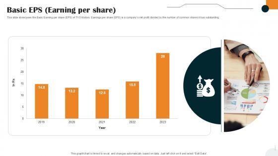 This slide showcases the Basic Earning per share EPS of TVS Motors. Earnings per share EPS is a companys net profit divided by the number of common shares it has outstanding. Create an editable Basic EPS Earning Per Share Vehicle Manufacturer Company Profile PPT Example CP SS V that communicates your idea and engages your audience. Whether you are presenting a business or an educational presentation, pre-designed presentation templates help save time. Basic EPS Earning Per Share Vehicle Manufacturer Company Profile PPT Example CP SS V is highly customizable and very easy to edit, covering many different styles from creative to business presentations. Slidegeeks has creative team members who have crafted amazing templates. So, go and get them without any delay. This slide showcases the Basic Earning per share EPS of TVS Motors. Earnings per share EPS is a companys net profit divided by the number of common shares it has outstanding.