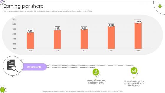 This slide represents on financial highlights of Accenture which represents earning per share for last five years from 2018 to 2022. The best PPT templates are a great way to save time, energy, and resources. Slidegeeks have 100 percent editable powerpoint slides making them incredibly versatile. With these quality presentation templates, you can create a captivating and memorable presentation by combining visually appealing slides and effectively communicating your message. Download Earning Per Share Professional Services And Technology Consulting Ppt Powerpoint CP SS V from Slidegeeks and deliver a wonderful presentation. This slide represents on financial highlights of Accenture which represents earning per share for last five years from 2018 to 2022.