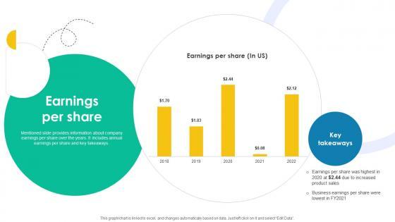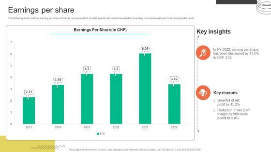 The following slide outlines earning per share of Nestle company which assists investors to determine whether investing in business will yield maximized profits or not. Slidegeeks is here to make your presentations a breeze with Earnings Per Share FMCG Provider Company Profile CP SS V With our easy-to-use and customizable templates, you can focus on delivering your ideas rather than worrying about formatting. With a variety of designs to choose from, you are sure to find one that suits your needs. And with animations and unique photos, illustrations, and fonts, you can make your presentation pop. So whether you are giving a sales pitch or presenting to the board, make sure to check out Slidegeeks first The following slide outlines earning per share of Nestle company which assists investors to determine whether investing in business will yield maximized profits or not.