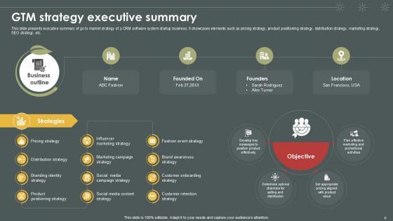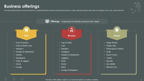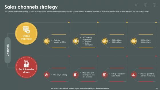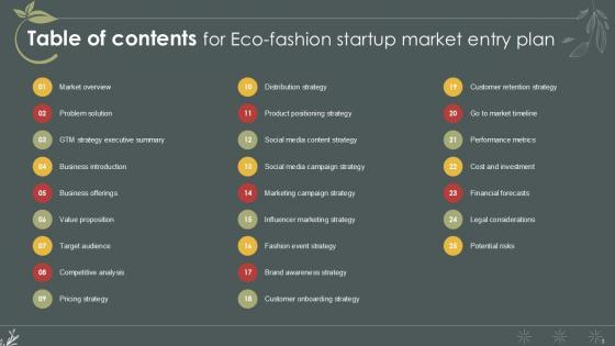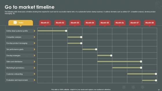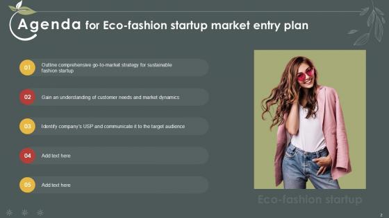 Do not compromise on a template that erodes your messages impact. Introducing our engaging Eco Fashion Startup Market Entry Plan Ppt Powerpoint GTM V complete deck, thoughtfully crafted to grab your audiences attention instantly. With this deck, effortlessly download and adjust elements, streamlining the customization process. Whether you are using Microsoft versions or Google Slides, it fits seamlessly into your workflow. Furthermore, its accessible in JPG, JPEG, PNG, and PDF formats, facilitating easy sharing and editing. Not only that you also play with the color theme of your slides making it suitable as per your audiences preference. Our Eco Fashion Startup Market Entry Plan Ppt Powerpoint GTM V are topically designed to provide an attractive backdrop to any subject. Use them to look like a presentation pro.