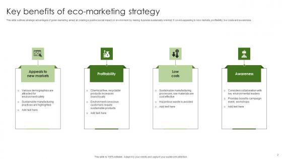 This slide outlines strategic advantages of green marketing aimed at creating a positive social impact on environment by making business sustainably oriented. It covers appealing to new markets, profitability, low costs and awareness. Pitch your topic with ease and precision using this Key Benefits Of Eco Marketing Strategy Infographics Pdf. This layout presents information on Profitability, Low Costs, Awareness. It is also available for immediate download and adjustment. So, changes can be made in the color, design, graphics or any other component to create a unique layout. This slide outlines strategic advantages of green marketing aimed at creating a positive social impact on environment by making business sustainably oriented. It covers appealing to new markets, profitability, low costs and awareness.
