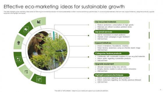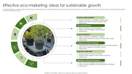 This slide highlights green marketing ideas aimed at following environmental protection for brand sustainability to obtain revenue and strong customer base. It covers recycled materials, email services, support initiatives, categorise products, upgrade equipment and highlight techniques. Showcasing this set of slides titled Effective Eco Marketing Ideas For Sustainable Growth Slides Pdf. The topics addressed in these templates are Email Services, Support Initiatives, Upgrade Equipment. All the content presented in this PPT design is completely editable. Download it and make adjustments in color, background, font etc. as per your unique business setting. This slide highlights green marketing ideas aimed at following environmental protection for brand sustainability to obtain revenue and strong customer base. It covers recycled materials, email services, support initiatives, categorise products, upgrade equipment and highlight techniques.