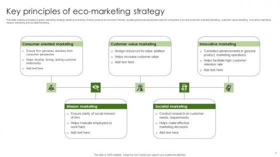 This slide outlines principles of green marketing strategy aimed at promoting firms to produce environment friendly, socially good products and services for consumers. It covers consumer oriented marketing, customer value marketing, innovative marketing, mission marketing and societal marketing. Pitch your topic with ease and precision using this Key Principles Of Eco Marketing Strategy Summary Pdf. This layout presents information on Consumer Oriented Marketing, Customer Value Marketing, Innovative Marketing. It is also available for immediate download and adjustment. So, changes can be made in the color, design, graphics or any other component to create a unique layout. This slide outlines principles of green marketing strategy aimed at promoting firms to produce environment friendly, socially good products and services for consumers. It covers consumer oriented marketing, customer value marketing, innovative marketing, mission marketing and societal marketing.