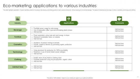 This slide highlights application of green marketing aimed at focusing on developing, advertising goods to meet customer demands without causing environmental damage. The basis of industries are beverage, furniture, cosmetics, technology and clothing. Pitch your topic with ease and precision using this Eco Marketing Applications To Various Industries Themes Pdf. This layout presents information on Industry, Applications, Comments. It is also available for immediate download and adjustment. So, changes can be made in the color, design, graphics or any other component to create a unique layout. This slide highlights application of green marketing aimed at focusing on developing, advertising goods to meet customer demands without causing environmental damage. The basis of industries are beverage, furniture, cosmetics, technology and clothing.