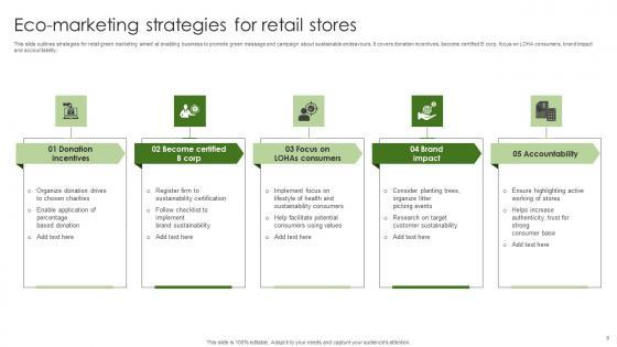 This slide outlines strategies for retail green marketing aimed at enabling business to promote green message and campaign about sustainable endeavours. It covers donation incentives, become certified B corp, focus on LOHA consumers, brand impact and accountability. Showcasing this set of slides titled Eco Marketing Strategies For Retail Stores Guidelines Pdf. The topics addressed in these templates are Donation Incentives, Consumers, Brand Impact. All the content presented in this PPT design is completely editable. Download it and make adjustments in color, background, font etc. as per your unique business setting. This slide outlines strategies for retail green marketing aimed at enabling business to promote green message and campaign about sustainable endeavours. It covers donation incentives, become certified B corp, focus on LOHA consumers, brand impact and accountability.