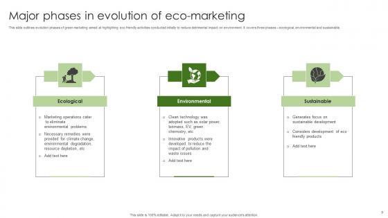 This slide outlines evolution phases of green marketing aimed at highlighting eco friendly activities conducted initially to reduce detrimental impact on environment. It covers three phases ecological, environmental and sustainable. Showcasing this set of slides titled Major Phases In Evolution Of Eco Marketing Topics Pdf. The topics addressed in these templates are Ecological, Environmental, Sustainable. All the content presented in this PPT design is completely editable. Download it and make adjustments in color, background, font etc. as per your unique business setting. This slide outlines evolution phases of green marketing aimed at highlighting eco friendly activities conducted initially to reduce detrimental impact on environment. It covers three phases ecological, environmental and sustainable.