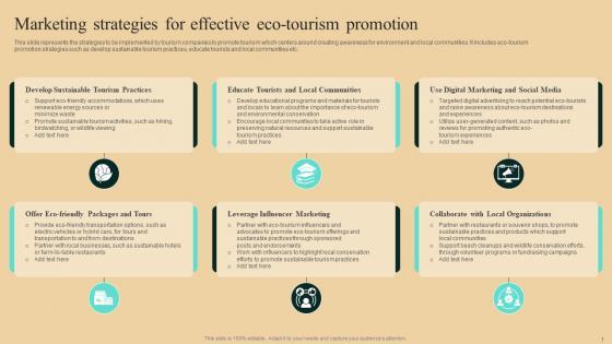 This slide represents the strategies to be implemented by tourism companies to promote tourism which centers around creating awareness for environment and local communities. It includes eco-tourism promotion strategies such as develop sustainable tourism practices, educate tourists and local communities etc. There are so many reasons you need a Guide To Winning Tourism Marketing Strategies For Effective Eco Tourism Promotion Demonstration Pdf The first reason is you can not spend time making everything from scratch, Thus, Slidegeeks has made presentation templates for you too. You can easily download these templates from our website easily. This slide represents the strategies to be implemented by tourism companies to promote tourism which centers around creating awareness for environment and local communities. It includes eco-tourism promotion strategies such as develop sustainable tourism practices, educate tourists and local communities etc.