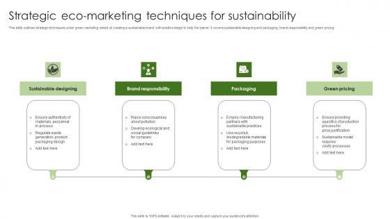 This slide outlines strategic techniques under green marketing aimed at creating a sustainable brand with positive image to help the planet. It covers sustainable designing and packaging, brand responsibility and green pricing. Pitch your topic with ease and precision using this Strategic Eco Marketing Techniques For Sustainability Guidelines Pdf. This layout presents information on Sustainable Designing, Brand Responsibility, Packaging. It is also available for immediate download and adjustment. So, changes can be made in the color, design, graphics or any other component to create a unique layout. This slide outlines strategic techniques under green marketing aimed at creating a sustainable brand with positive image to help the planet. It covers sustainable designing and packaging, brand responsibility and green pricing.