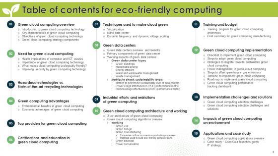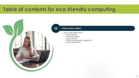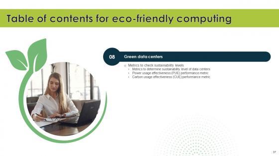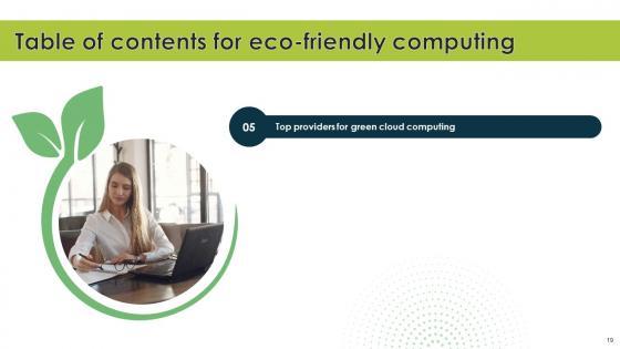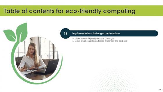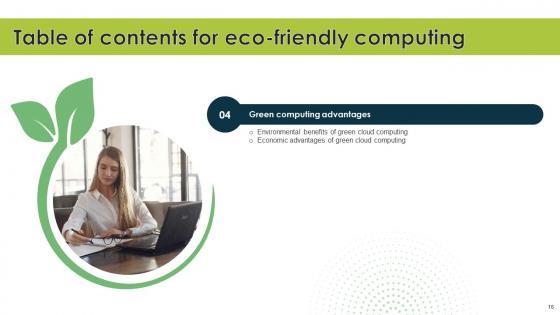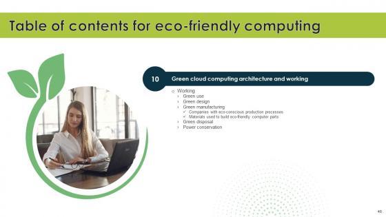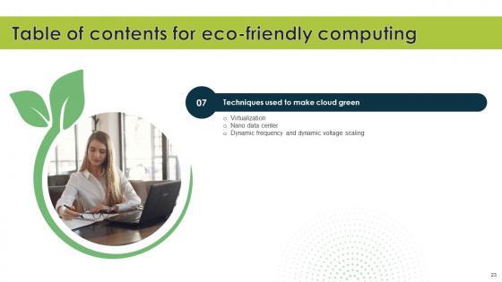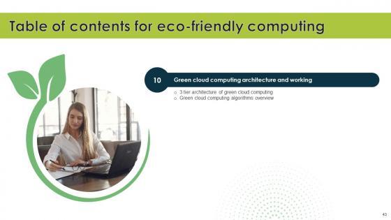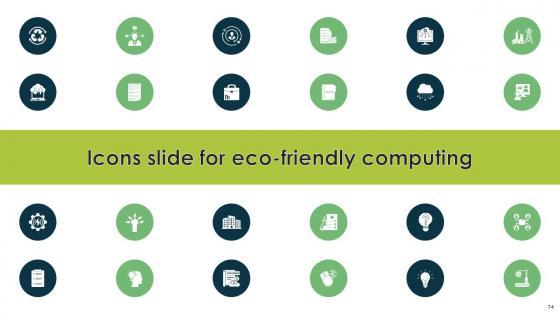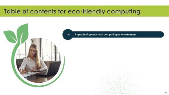 Use this meticulously designed PPT deck to make the data presentation and understanding easy for the audience. It is an ideal option for your presentation as it covers all the critical elements of the concept and design. Bring your best foot forward and show your presentation skills with this expertly-designed Eco Friendly Computing IT Ppt Powerpoint Presentation Complete Deck. Take the help of this PowerPoint Set to deliver a neat, professional presentation and win the applause of viewers. Customize the images, text, format, colors, and theme of any and every template of this presentation deck using the help manual come along. Get hold of this PPT bundle from the link below. Our Eco Friendly Computing IT Ppt Powerpoint Presentation Complete Deck are topically designed to provide an attractive backdrop to any subject. Use them to look like a presentation pro.