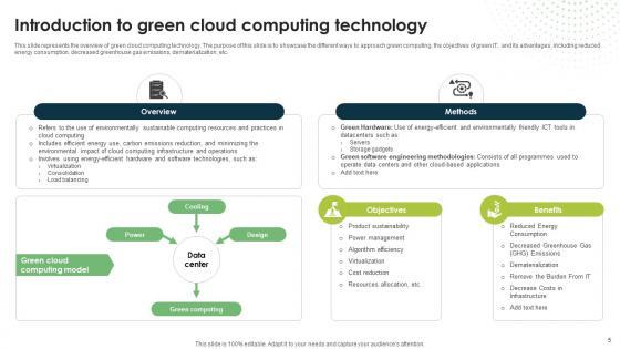 This slide represents the overview of green cloud computing technology. The purpose of this slide is to showcase the different ways to approach green computing, the objectives of green IT, and its advantages, including reduced energy consumption, decreased greenhouse gas emissions, dematerialization, etc.Slidegeeks has constructed Introduction To Green Cloud Computing Technology Eco Friendly Computing IT after conducting extensive research and examination. These presentation templates are constantly being generated and modified based on user preferences and critiques from editors. Here, you will find the most attractive templates for a range of purposes while taking into account ratings and remarks from users regarding the content. This is an excellent jumping-off point to explore our content and will give new users an insight into our top-notch PowerPoint Templates. This slide represents the overview of green cloud computing technology. The purpose of this slide is to showcase the different ways to approach green computing, the objectives of green IT, and its advantages, including reduced energy consumption, decreased greenhouse gas emissions, dematerialization, etc.