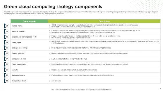 This slide represents the components of a green cloud computing strategy. The purpose of this slide is to showcase the different components of green computing strategy, including remote work, smart technology, upgrading and rearranging data centers, power down, strategic scheduling, display selection, and so on.Are you in need of a template that can accommodate all of your creative concepts This one is crafted professionally and can be altered to fit any style. Use it with Google Slides or PowerPoint. Include striking photographs, symbols, depictions, and other visuals. Fill, move around, or remove text boxes as desired. Test out color palettes and font mixtures. Edit and save your work, or work with colleagues. Download Green Cloud Computing Strategy Components Eco Friendly Computing IT and observe how to make your presentation outstanding. Give an impeccable presentation to your group and make your presentation unforgettable. This slide represents the components of a green cloud computing strategy. The purpose of this slide is to showcase the different components of green computing strategy, including remote work, smart technology, upgrading and rearranging data centers, power down, strategic scheduling, display selection, and so on.