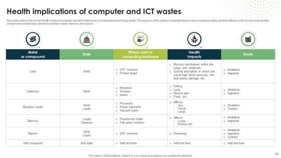 This slide outlines the human health impact of computer and information and communication technology waste. The purpose of this slide is to highlight the primary computing metals and their effects on the human body and the components include lead, cadmium, beryllium oxide, mercury, and barium.This Health Implications Of Computer And ICT Wastes Eco Friendly Computing IT is perfect for any presentation, be it in front of clients or colleagues. It is a versatile and stylish solution for organizing your meetings. The Health Implications Of Computer And ICT Wastes Eco Friendly Computing IT features a modern design for your presentation meetings. The adjustable and customizable slides provide unlimited possibilities for acing up your presentation. Slidegeeks has done all the homework before launching the product for you. So, do not wait, grab the presentation templates today This slide outlines the human health impact of computer and information and communication technology waste. The purpose of this slide is to highlight the primary computing metals and their effects on the human body and the components include lead, cadmium, beryllium oxide, mercury, and barium.