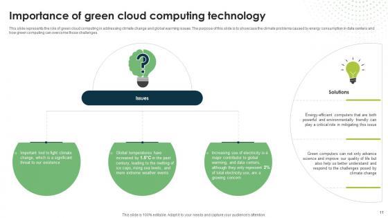 This slide represents the role of green cloud computing in addressing climate change and global warming issues. The purpose of this slide is to showcase the climate problems caused by energy consumption in data centers and how green computing can overcome those challenges.The Importance Of Green Cloud Computing Technology Eco Friendly Computing IT is a compilation of the most recent design trends as a series of slides. It is suitable for any subject or industry presentation, containing attractive visuals and photo spots for businesses to clearly express their messages. This template contains a variety of slides for the user to input data, such as structures to contrast two elements, bullet points, and slides for written information. Slidegeeks is prepared to create an impression. This slide represents the role of green cloud computing in addressing climate change and global warming issues. The purpose of this slide is to showcase the climate problems caused by energy consumption in data centers and how green computing can overcome those challenges.