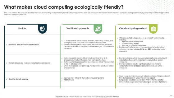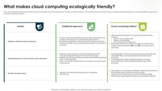 This slide outlines the various factors that make cloud computing environmentally friendly. The purpose of this slide is to showcase the reasons that make cloud computing ecologically friendly by comparing traditional approaches and cloud computing methods.Coming up with a presentation necessitates that the majority of the effort goes into the content and the message you intend to convey. The visuals of a PowerPoint presentation can only be effective if it supplements and supports the story that is being told. Keeping this in mind our experts created What Makes Cloud Computing Ecologically Friendly Eco Friendly Computing IT to reduce the time that goes into designing the presentation. This way, you can concentrate on the message while our designers take care of providing you with the right template for the situation. This slide outlines the various factors that make cloud computing environmentally friendly. The purpose of this slide is to showcase the reasons that make cloud computing ecologically friendly by comparing traditional approaches and cloud computing methods.