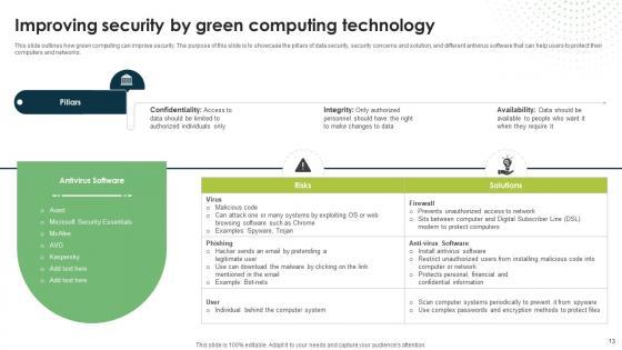 This slide outlines how green computing can improve security. The purpose of this slide is to showcase the pillars of data security, security concerns and solution, and different antivirus software that can help users to protect their computers and networks.Are you searching for a Improving Security By Green Computing Technology Eco Friendly Computing IT that is uncluttered, straightforward, and original Its easy to edit, and you can change the colors to suit your personal or business branding. For a presentation that expresses how much effort you have put in, this template is ideal With all of its features, including tables, diagrams, statistics, and lists, its perfect for a business plan presentation. Make your ideas more appealing with these professional slides. Download Improving Security By Green Computing Technology Eco Friendly Computing IT from Slidegeeks today. This slide outlines how green computing can improve security. The purpose of this slide is to showcase the pillars of data security, security concerns and solution, and different antivirus software that can help users to protect their computers and networks.