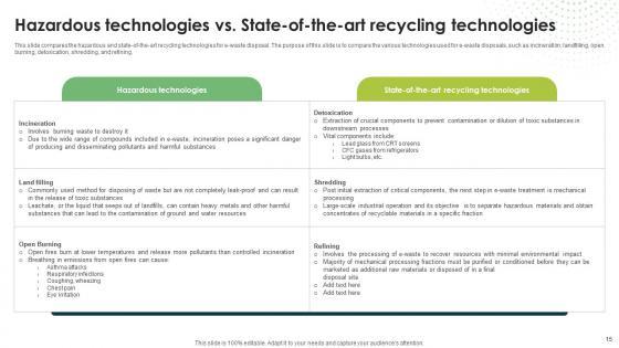 This slide compares the hazardous and state-of-the-art recycling technologies for e-waste disposal. The purpose of this slide is to compare the various technologies used for e-waste disposals, such as incineration, landfilling, open burning, detoxication, shredding, and refining.This modern and well-arranged Hazardous Technologies Vs State Of The Art Recycling Technologies Eco Friendly Computing IT provides lots of creative possibilities. It is very simple to customize and edit with the Powerpoint Software. Just drag and drop your pictures into the shapes. All facets of this template can be edited with Powerpoint, no extra software is necessary. Add your own material, put your images in the places assigned for them, adjust the colors, and then you can show your slides to the world, with an animated slide included. This slide compares the hazardous and state-of-the-art recycling technologies for e-waste disposal. The purpose of this slide is to compare the various technologies used for e-waste disposals, such as incineration, landfilling, open burning, detoxication, shredding, and refining.
