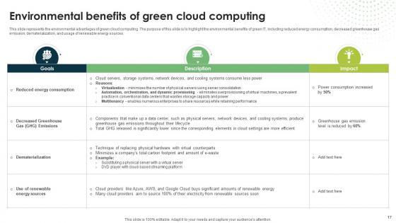 This slide represents the environmental advantages of green cloud computing. The purpose of this slide is to highlight the environmental benefits of green IT, including reduced energy consumption, decreased greenhouse gas emission, dematerialization, and usage of renewable energy sources.Do you have an important presentation coming up Are you looking for something that will make your presentation stand out from the rest Look no further than Environmental Benefits Of Green Cloud Computing Eco Friendly Computing IT. With our professional designs, you can trust that your presentation will pop and make delivering it a smooth process. And with Slidegeeks, you can trust that your presentation will be unique and memorable. So why wait Grab Environmental Benefits Of Green Cloud Computing Eco Friendly Computing IT today and make your presentation stand out from the rest This slide represents the environmental advantages of green cloud computing. The purpose of this slide is to highlight the environmental benefits of green IT, including reduced energy consumption, decreased greenhouse gas emission, dematerialization, and usage of renewable energy sources.