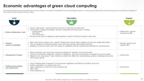 This slide illustrates the economic benefits of green cloud computing. This slide aims to highlight the economic advantages of green IT, covering reducing infrastructure costs, enhancing resource availability, eliminating the IT teams burden, and promoting remote work culture.Slidegeeks is here to make your presentations a breeze with Economic Advantages Of Green Cloud Computing Eco Friendly Computing IT With our easy-to-use and customizable templates, you can focus on delivering your ideas rather than worrying about formatting. With a variety of designs to choose from, you are sure to find one that suits your needs. And with animations and unique photos, illustrations, and fonts, you can make your presentation pop. So whether you are giving a sales pitch or presenting to the board, make sure to check out Slidegeeks first This slide illustrates the economic benefits of green cloud computing. This slide aims to highlight the economic advantages of green IT, covering reducing infrastructure costs, enhancing resource availability, eliminating the IT teams burden, and promoting remote work culture.
