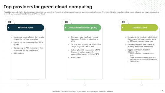 This slide represents the top cloud service providers for green computing. This slide aims to showcase the prominent cloud providers for green IT by highlighting the percentage of total energy efficiency and the providers include Microsoft Azure, Amazon Web Services, and Alibaba Cloud.Find highly impressive Top Providers For Green Cloud Computing Eco Friendly Computing IT on Slidegeeks to deliver a meaningful presentation. You can save an ample amount of time using these presentation templates. No need to worry to prepare everything from scratch because Slidegeeks experts have already done a huge research and work for you. You need to download Top Providers For Green Cloud Computing Eco Friendly Computing IT for your upcoming presentation. All the presentation templates are 100 percent editable and you can change the color and personalize the content accordingly. Download now This slide represents the top cloud service providers for green computing. This slide aims to showcase the prominent cloud providers for green IT by highlighting the percentage of total energy efficiency and the providers include Microsoft Azure, Amazon Web Services, and Alibaba Cloud.