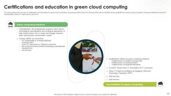 This slide outlines the overview of certifications and education in green cloud computing. The purpose of this slide is to showcase the various initiative and accreditations for green cloud computing. The green initiatives include ICT sustainability, Green ICT approaches, and so on.Want to ace your presentation in front of a live audience Our Certifications And Education In Green Cloud Computing Eco Friendly Computing IT can help you do that by engaging all the users towards you. Slidegeeks experts have put their efforts and expertise into creating these impeccable powerpoint presentations so that you can communicate your ideas clearly. Moreover, all the templates are customizable, and easy-to-edit and downloadable. Use these for both personal and commercial use. This slide outlines the overview of certifications and education in green cloud computing. The purpose of this slide is to showcase the various initiative and accreditations for green cloud computing. The green initiatives include ICT sustainability, Green ICT approaches, and so on.