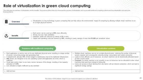 This slide gives an overview of virtualization and its benefits. The purpose of this slide is to showcase the overview of virtualization and issues with traditional computing systems and how virtualization can overcome those problems. Do you have to make sure that everyone on your team knows about any specific topic I yes, then you should give Role Of Virtualization In Green Cloud Computing Eco Friendly Computing IT a try. Our experts have put a lot of knowledge and effort into creating this impeccable Role Of Virtualization In Green Cloud Computing Eco Friendly Computing IT. You can use this template for your upcoming presentations, as the slides are perfect to represent even the tiniest detail. You can download these templates from the Slidegeeks website and these are easy to edit. So grab these today This slide gives an overview of virtualization and its benefits. The purpose of this slide is to showcase the overview of virtualization and issues with traditional computing systems and how virtualization can overcome those problems.