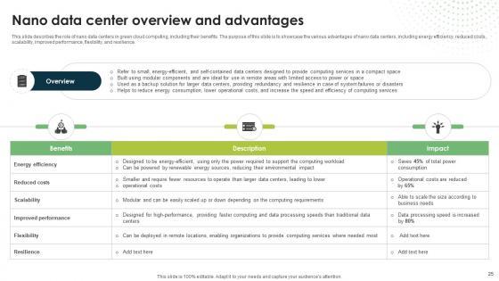 This slide describes the role of nano data centers in green cloud computing, including their benefits. The purpose of this slide is to showcase the various advantages of nano data centers, including energy efficiency, reduced costs, scalability, improved performance, flexibility, and resilience.Take your projects to the next level with our ultimate collection of Nano Data Center Overview And Advantages Eco Friendly Computing IT. Slidegeeks has designed a range of layouts that are perfect for representing task or activity duration, keeping track of all your deadlines at a glance. Tailor these designs to your exact needs and give them a truly corporate look with your own brand colors they will make your projects stand out from the rest This slide describes the role of nano data centers in green cloud computing, including their benefits. The purpose of this slide is to showcase the various advantages of nano data centers, including energy efficiency, reduced costs, scalability, improved performance, flexibility, and resilience.