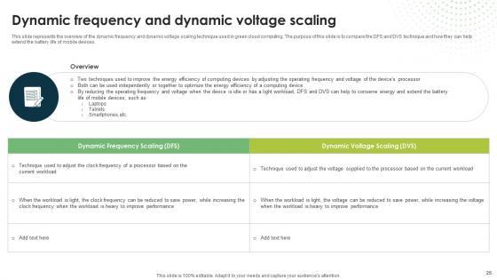 This slide represents the overview of the dynamic frequency and dynamic voltage scaling technique used in green cloud computing. The purpose of this slide is to compare the DFS and DVS technique and how they can help extend the battery life of mobile devices.Present like a pro with Dynamic Frequency And Dynamic Voltage Scaling Eco Friendly Computing IT. Create beautiful presentations together with your team, using our easy-to-use presentation slides. Share your ideas in real-time and make changes on the fly by downloading our templates. So whether you are in the office, on the go, or in a remote location, you can stay in sync with your team and present your ideas with confidence. With Slidegeeks presentation got a whole lot easier. Grab these presentations today. This slide represents the overview of the dynamic frequency and dynamic voltage scaling technique used in green cloud computing. The purpose of this slide is to compare the DFS and DVS technique and how they can help extend the battery life of mobile devices.