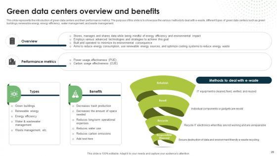 This slide represents the introduction of green data centers and their performance metrics. The purpose of this slide is to showcase the various methods to deal with e-waste, different types of green data centers such as green buildings, renewable energy, energy efficiency, water management, and waste management.Make sure to capture your audiences attention in your business displays with our gratis customizable Green Data Centers Overview And Benefits Eco Friendly Computing IT. These are great for business strategies, office conferences, capital raising or task suggestions. If you desire to acquire more customers for your tech business and ensure they stay satisfied, create your own sales presentation with these plain slides. This slide represents the introduction of green data centers and their performance metrics. The purpose of this slide is to showcase the various methods to deal with e-waste, different types of green data centers such as green buildings, renewable energy, energy efficiency, water management, and waste management.