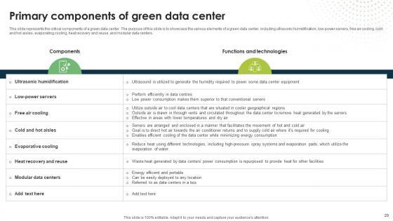 This slide represents the critical components of a green data center. The purpose of this slide is to showcase the various elements of a green data center, including ultrasonic humidification, low-power servers, free air cooling, cold and hot aisles, evaporating cooling, heat recovery and reuse, and modular data centers.Want to ace your presentation in front of a live audience Our Primary Components Of Green Data Center Eco Friendly Computing IT can help you do that by engaging all the users towards you. Slidegeeks experts have put their efforts and expertise into creating these impeccable powerpoint presentations so that you can communicate your ideas clearly. Moreover, all the templates are customizable, and easy-to-edit and downloadable. Use these for both personal and commercial use. This slide represents the critical components of a green data center. The purpose of this slide is to showcase the various elements of a green data center, including ultrasonic humidification, low-power servers, free air cooling, cold and hot aisles, evaporating cooling, heat recovery and reuse, and modular data centers.