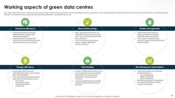 This slide outlines the various working aspects of green data centres to reduce carbon emissions and efficient power consumption. This slide highlights the different functional elements of green data centres, including hardware efficiency, renewable energy, waste management, energy efficiency, virtualization and so on.This modern and well-arranged Working Aspects Of Green Data Centres Eco Friendly Computing IT provides lots of creative possibilities. It is very simple to customize and edit with the Powerpoint Software. Just drag and drop your pictures into the shapes. All facets of this template can be edited with Powerpoint, no extra software is necessary. Add your own material, put your images in the places assigned for them, adjust the colors, and then you can show your slides to the world, with an animated slide included. This slide outlines the various working aspects of green data centres to reduce carbon emissions and efficient power consumption. This slide highlights the different functional elements of green data centres, including hardware efficiency, renewable energy, waste management, energy efficiency, virtualization and so on.