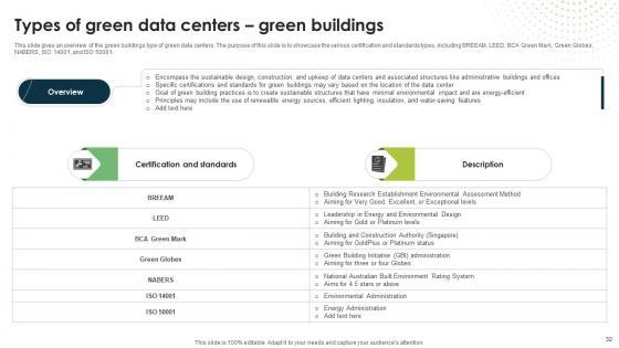 This slide gives an overview of the green buildings type of green data centers. The purpose of this slide is to showcase the various certification and standards types, including BREEAM, LEED, BCA Green Mark, Green Globes, NABERS, ISO 14001, and ISO 50001.Are you in need of a template that can accommodate all of your creative concepts This one is crafted professionally and can be altered to fit any style. Use it with Google Slides or PowerPoint. Include striking photographs, symbols, depictions, and other visuals. Fill, move around, or remove text boxes as desired. Test out color palettes and font mixtures. Edit and save your work, or work with colleagues. Download Types Of Green Data Centers Green Buildings Eco Friendly Computing IT and observe how to make your presentation outstanding. Give an impeccable presentation to your group and make your presentation unforgettable. This slide gives an overview of the green buildings type of green data centers. The purpose of this slide is to showcase the various certification and standards types, including BREEAM, LEED, BCA Green Mark, Green Globes, NABERS, ISO 14001, and ISO 50001.